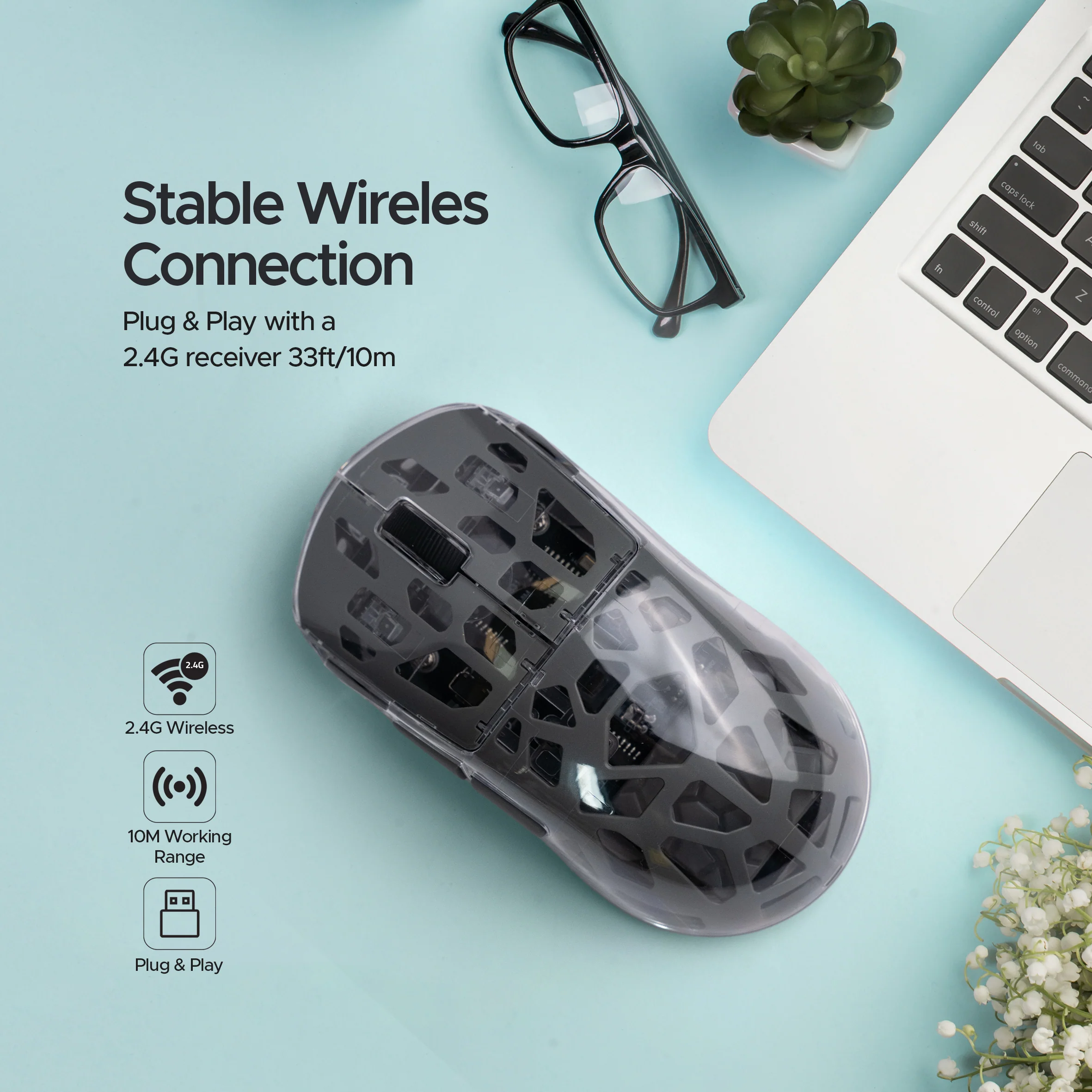 - Double connectivité : basculez facilement entre les modes Bluetooth et sans fil 2,4 GHz pour une utilisation polyvalente sur les ordinateurs portables, les PC et les tablettes.